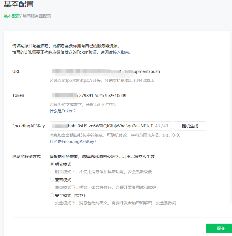 token为自己设置的字符串,可用MD5加密获得。加密方式可选择明文模式(考虑安全性可用安全模式)