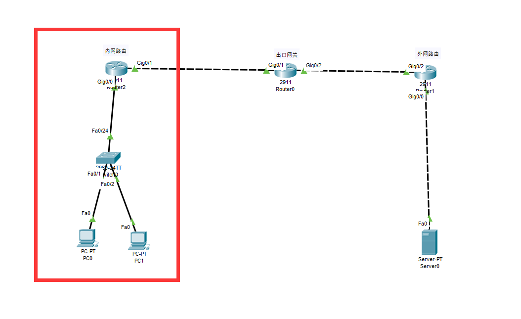 说明:被红色矩形圈中的部分为单臂路由配置,如果单臂路由配置比较薄弱,请点击链接进行学习: