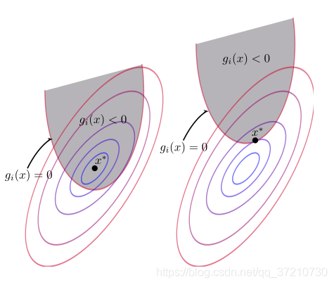 的约束条件一样考虑就行,如果不是相切关系那么函数值还会向着令f(x)更小的方向去走,那么x*就不是最小值点,因此会有g(x)与f(x)在x*点是相切关系。因而有在点x*处f(x)和g(x)的梯度在同一条直线上,即▽f(x) +