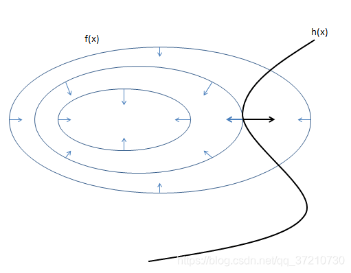 ,显然,只有当h(x)和等值线相切时才能取到极值点(若不是相切点,那么势必能找到x’使得f(x’)<f(x)),因此在切点必有▽f(x)与▽h(x)(梯度)在一条直线上,由此我们可以得到如下等式成立: