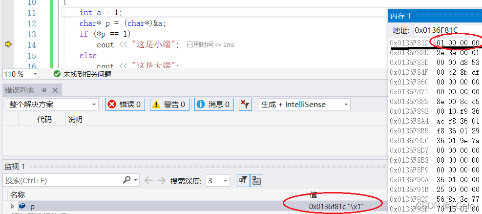 可以看到,a是整型,占了4个字节,如果我们把它强制类型转换为char,那么我们就可以取到它低地址的一个字节,然后a又为1,所以根据存储形式,它只能为 00 或者 01,然后我们就可以判断,强制转换后的值是否为1,如果为1,则是小端,否则就是大端了。