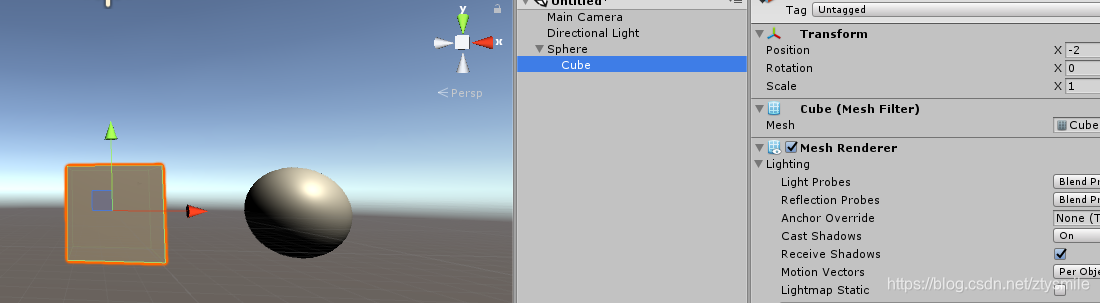 如图,cube是在世界坐标的(0,0,0)位置,球的世界坐标是(2,0,0)但是现在可以看见,我们把Sphere设为了Cube 的父物体,现在cube的坐标变成了(-2,0,0) ,也就是说现在cube是以Sphere的坐标系为标准的,也就是说Cube在Sphere坐标系中的位置是(-2,0,0);