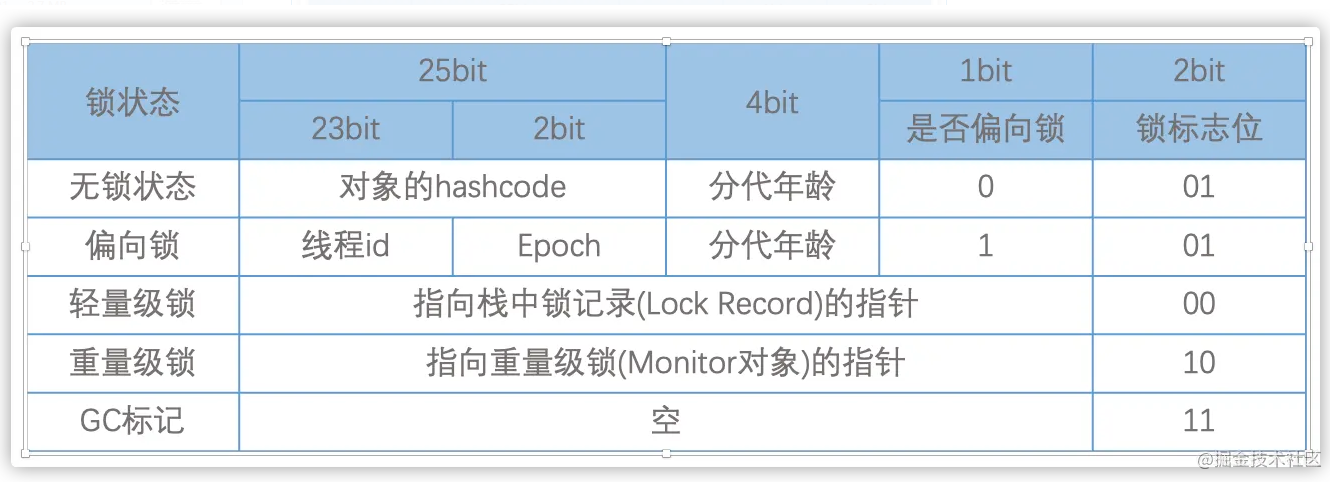 - 无锁状态和偏向锁标记位为01,轻量级锁的状态为00,重量级锁的状态为10