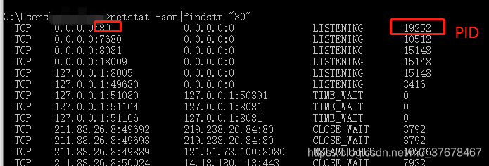 5、输入tasklist|findstr “19252”,回车,查看是哪个进程或者程序占用了80端口,结果是:httpd.exe。问题找到了,之前我以为是apache服务,所以我去任务管理器之类的查看服务均找不到apache相关的服务,原来的httpd开头的服务。