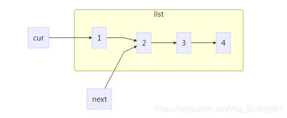 设置两个引用, cur, next 分别指向当前和下一个节点