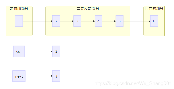 和全部反转一样, 相当于把链表分为了三段, 反转中间那段, 再将三段连接起来