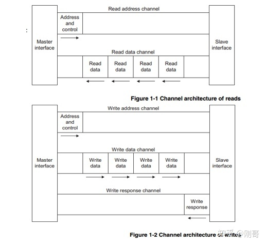 五个通道为独立的通道,可大大提供系统传输性能。需要注意读操作有2个通道,写操作有3个通道,读通道中没有单独的响应通道,读响应与读数据共用一个通道传输,都是slave一块返回没有必要分离。