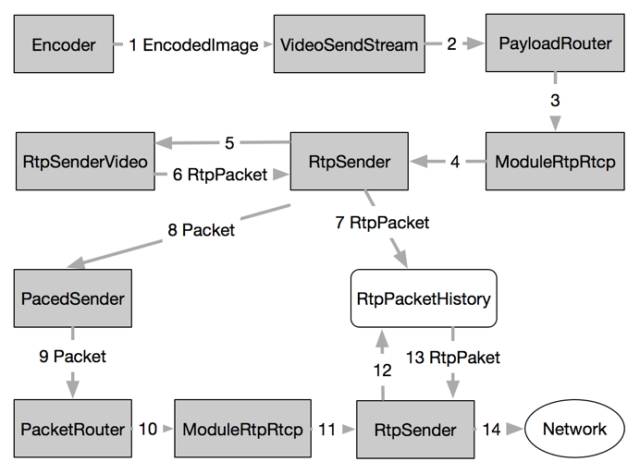 ncode线程调用编码器(比如VP8)对采集到的RawVideoFrame进行编码,编码完成以后,其输出EncodedImage通过回调到达VideoSendStream::Encoded()函数,进而通过PayloadRouter路由到ModuleRtpRtcpImpl::SendOutgoingData()。