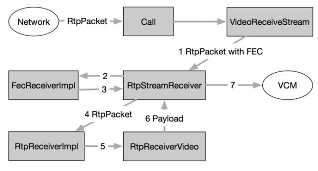 RtpStreamReceiver::ReceivePacket()首先判断数据包是否是FEC报文,如果是则调用FecReceiver进行解包,否则直接调用RtpReceiver::IncomingRtpPacket()。