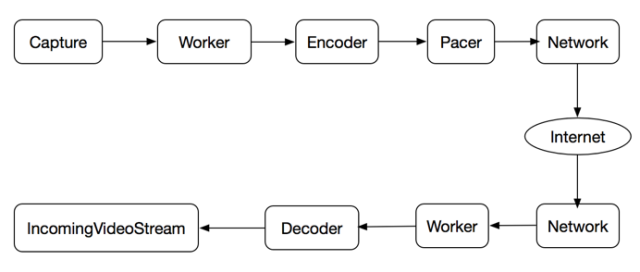 在接收端,Network线程从网络接收字节流,接着Worker线程反序列化为RTP数据包,并在VCM模块进行组帧操作。Decoder线程对组帧完成的数据帧进行解码操作,解码后的原始数据VideoFrame会推送到IncomingVideoStream线程,该线程把VideoStream投放到render进行渲染显示。