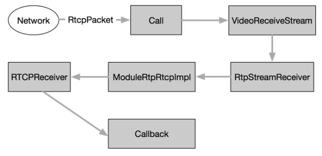 在接收端,RTCP报文的接收流程和RTP一样,经过网络接收之后到达Call对象,进而通过SSRC找到VideoReceiveStream,继而到达RtpStreamReceiver。接下来RTCP报文的解析和反馈操作都在ModuleRtpRtcpImpl::IncomingRtcpPacket()函数中完成。