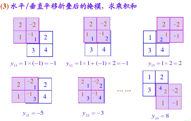 B(0,0)=G(0,0)F(0,0)+G(0,1)F(0,-1)+G(1,0)F(-1,0)+G(1,1)F(-1,-1)最后代入数值,需要注意的是F为周期性函数,G为卷积核,F为被卷机矩阵,那么F应被扩展为(m+n)维的方阵,m、n分别为G、F的维数,且这个矩阵多余的补0,最终计算的式子其实与方法二相同。