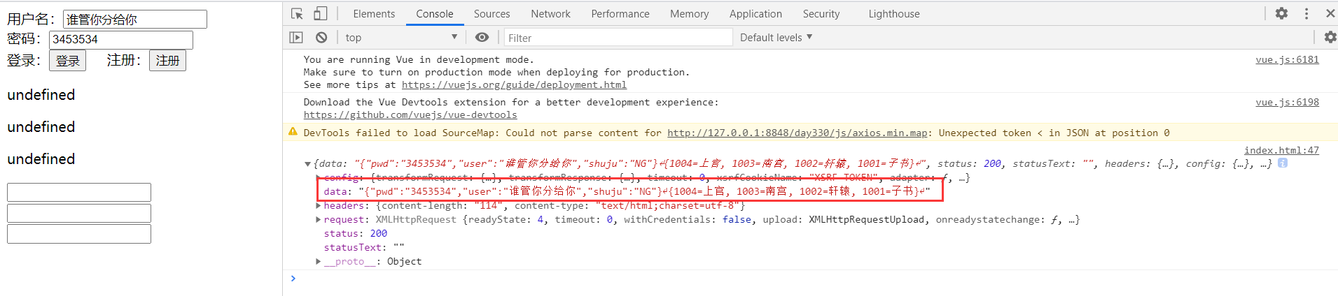 - 用p标签,通过id获取后填入数据。(例如:document.getElementById(“aaa”).innerText=res.data.user;)