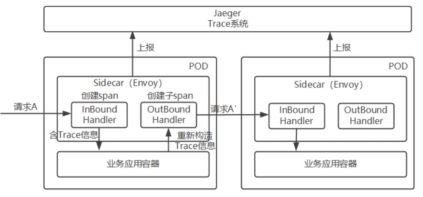 请求经过sidecar,sidecar创建span,sidecar直接上报trace信息(如envoyAcessLogService)给trace系统(如jaeger、skywalking)。 旧版本是通过Mixer的Adapter对接的,这里不再提及。