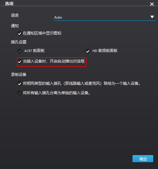 一下笨办法是把麦克风拔了,再重新插入粉红色的麦克风插孔,如果你的“Realtek高清晰音频管理器”设置了检测到新设备自动弹出,则会自动弹出。相关的设置如下图所示: