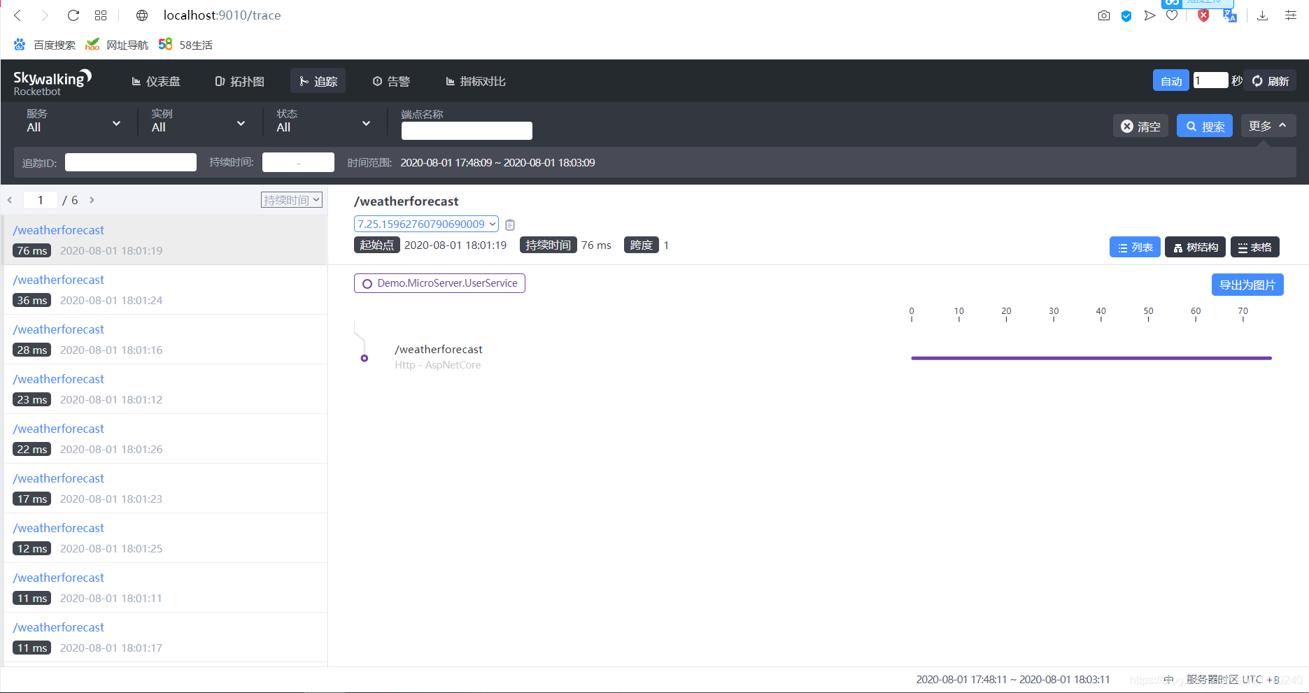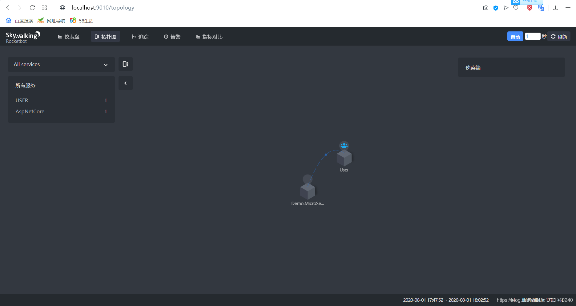 启动项目,然后一直刷新页面,(我大概等了10秒)在skywaling页面中就可以看到我访问的记录了