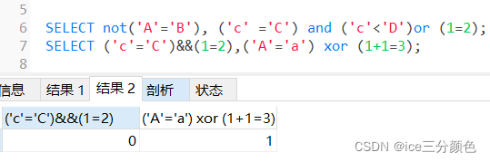 例:SELECT not(‘A’=’B’), (‘c’ =’C’) and (‘c'<‘D’)or (1=2);