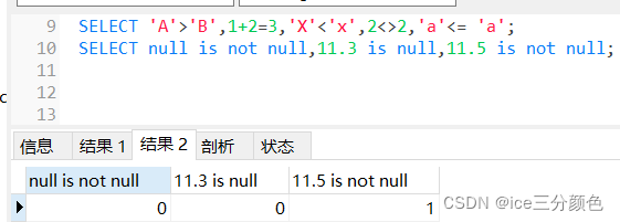 例:SELECT ‘A’>’B’,1+2=3,’X'<‘x’,2<>2,’a'<= ‘a’;