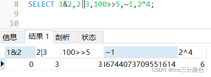 例:SELECT 1&2,2|3,100>>5,~1,2^4;