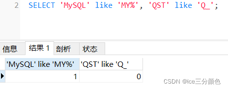 例:SELECT ‘MySQL’ like ‘MY%’, ‘QST’ like ‘Q_’;
