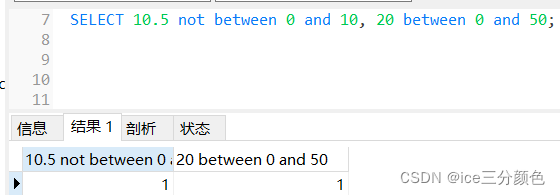 例:SELECT 10.5 not between 0 and 10, 20 between 0 and 50;