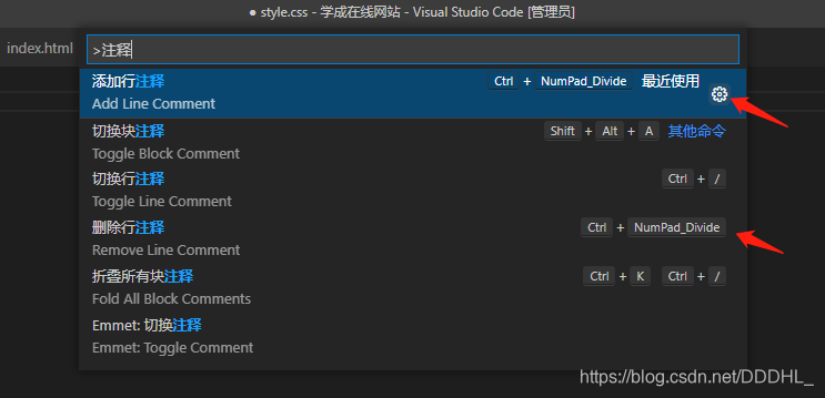 2、在弹出的窗口输入注释,然后瞄准添加行注释和删除行注释,点击后面的齿轮即可更换快捷键