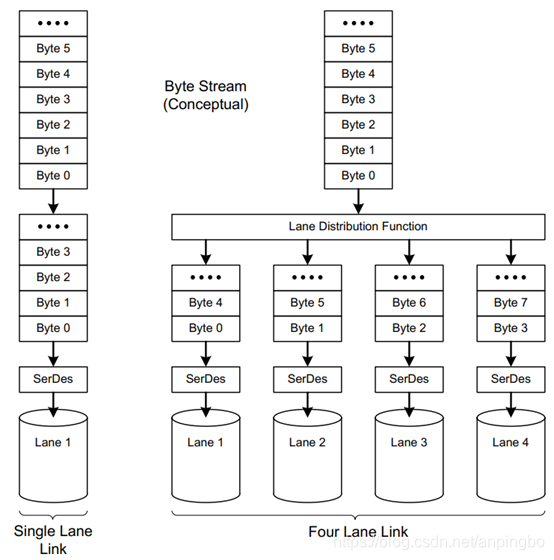 物理层可以支持1到4条差分数据链路,以及一条时钟差分通路。为了适配不同链路数量的传输,其可以实现数据的多路转换。比如物理层有4路,而更上一层只有一个通路,那么由上层过来的数据可以被间隔的分配到每个物理通路上。