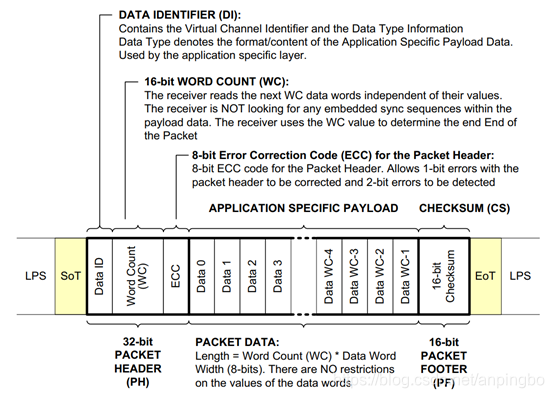 个数据。ECC校验可以纠正1bit数据错误以及检测2bit数据错误。其中的有效图像数据长度可以任意,报文之间间隔距离也任意。对于YUV,RGB,RAW格式的数据,一个长报文中应该含有1行图像数据。对于在同一个通道内的同一帧数据中,每个长报文包含的数据应该相同。