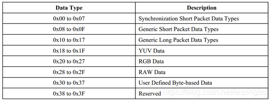 高2bit用于虚拟通道,低6bit是数据类型。虚拟通道支持4个,其和物理上支持的4个数据链路没有对应关系,虚拟通道可以方便不同通道处理不同类型的数据。数据类型可以支持64种,包括长短报文数据类型,图像数据类型,以及用户自定义类型。