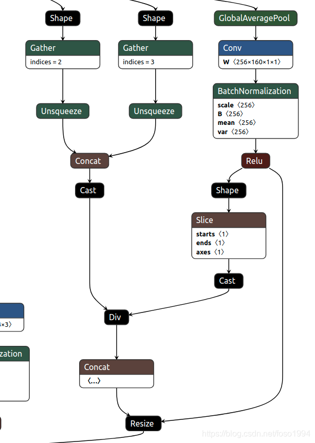插值操作,但是另我不解的是,明明一个简单上采样,为什么会多出两个Gather分支?由网络结构中可以看到这个两个分支是用来取到x.shape的第2和第3个索引的,于是我打开pycharm的调试,发现对于x这个Tensor的shape属性,并不是我以为的[a,b,c,d]这种形式,而是[Tensor(a),Tensor(b),Tensor(c),Tensor(d)]!也就是说,对于shape中的每一个维度并不是int类型,而是每个int类型的数构成的1*1的Tensor.