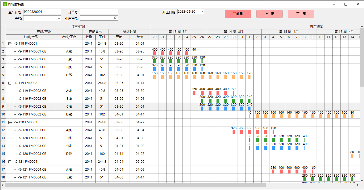 基础资料准备好后,就可以录入或者导入生产计划、计算产线需求、进行生产排程,排程效果以甘特图展示。