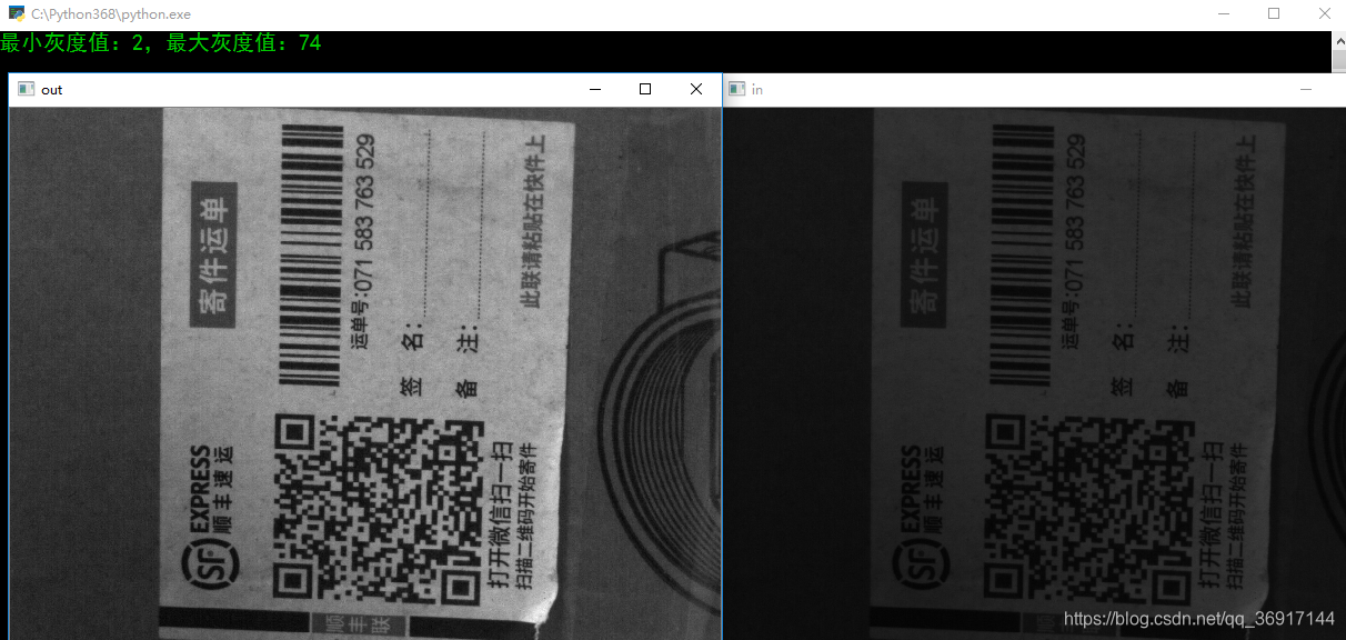 print("最小灰度值:%d,最大灰度值:%d"%(A,B))