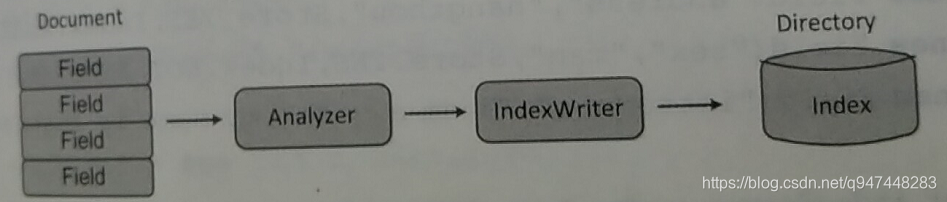 Lucence 索引的构建分这样几步,通过制定的数据格式,检Lucence的Document 传递给分词器Analyzer进行分词,经过分词器之后,通用索引吸入工具IndexWriter将索引写入到制定的目录。