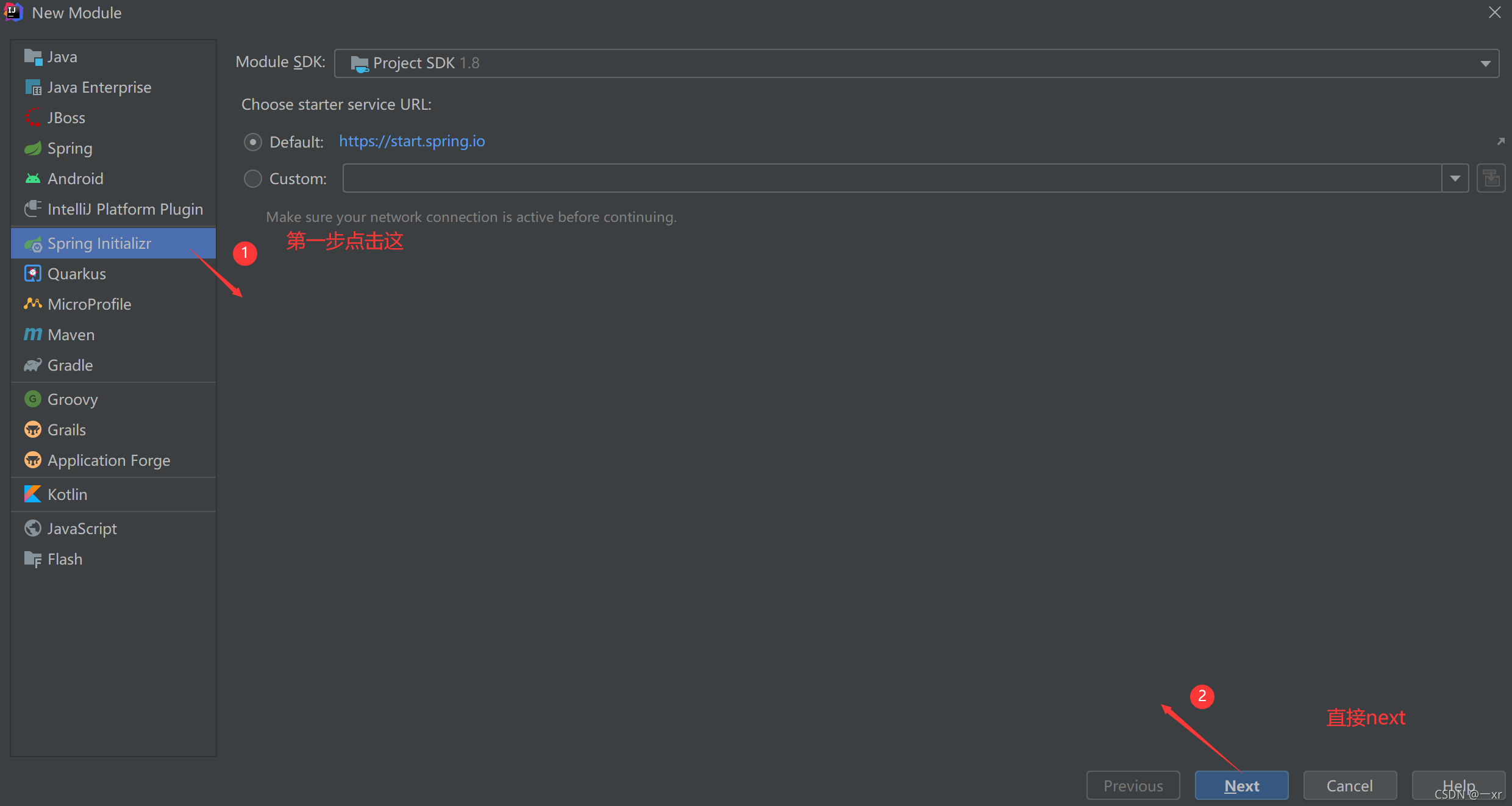 就会进入这个界面,选择Spring Initializr,直接Next;
