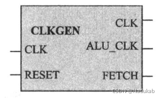时钟发生器 CLKGEN 利用外来时钟信号clk 来生成一系列时钟信号clk1、fetch、alu_ena 送往CPU的其他部件。
