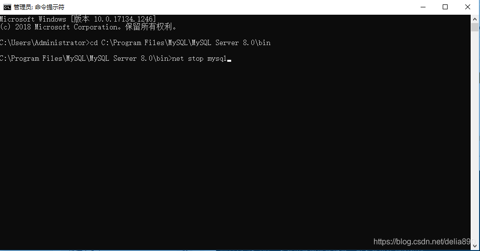 1.以管理员身份进入cmd,进入bin目录,输入net stop mysql停止服务