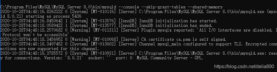 2,输入mysqld –console –skip-grant-tables –shared-memory