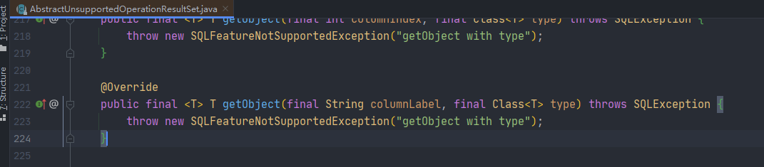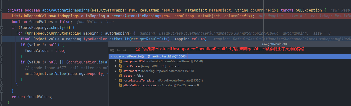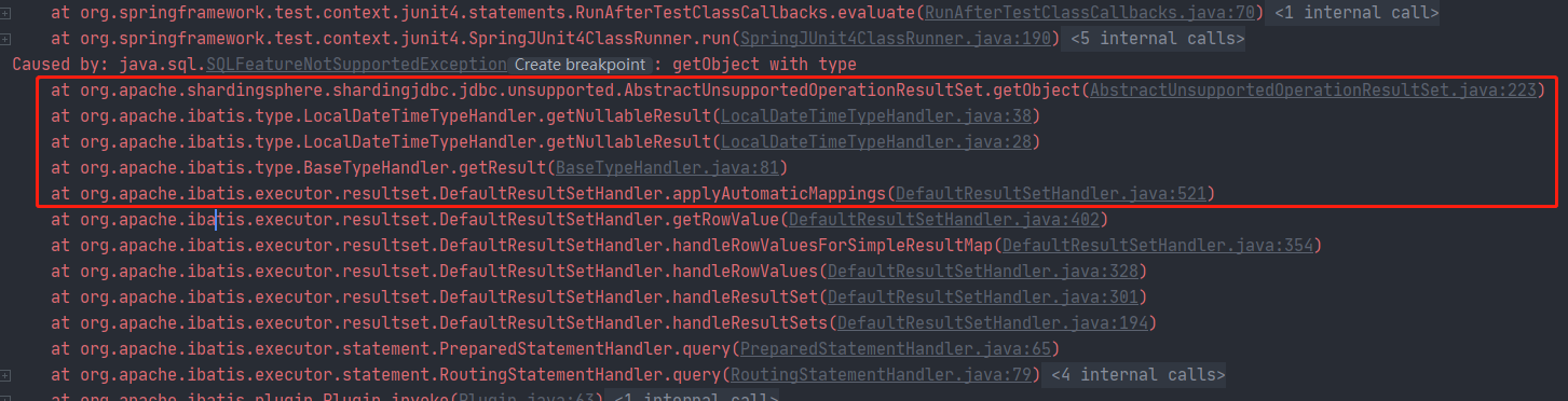2、T getObject(final String columnLabel, final Class<T> type) 调用直接抛出异常,字面意思是说它不支持这个类型吧。这个类是ShardingJdbc的,再根据异常往下看,是在哪里调用的ShardingJdbc的这个方法。