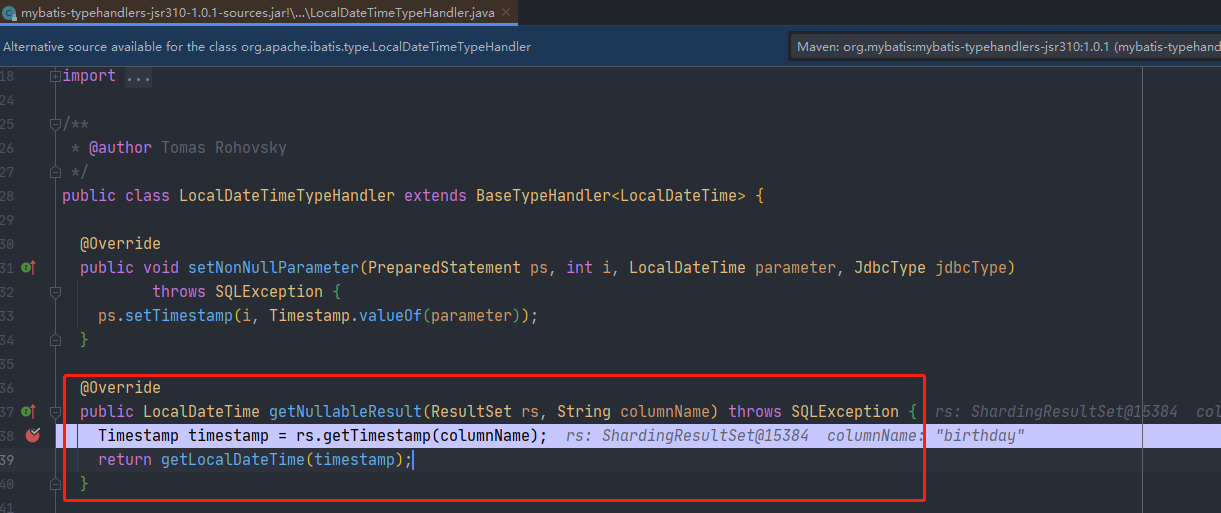 因为它重写并覆盖了LocalDateTimeTypeHandler.java,这样它就不会去调用ShardingJdbc的rs.getObject的方法了,直接就转换并返回结果了。