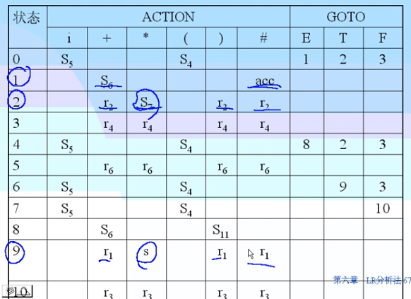 6.7.8.9.10.11状态都是可以规约的相应的方框内部的数字是状态,而后面的产生式,则是根据该产生式,可以将这个产生式右部进行规约,即如果栈内从栈底到栈顶如果依次是abcd,则首先d规约成B,B和c规约成B,B和b规约成E,E与a规约成E。