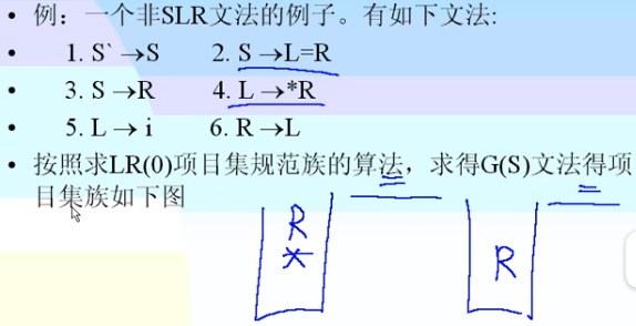 如果遇到=号,将*R规约成L,即只有使用2进行推导时,才能接受=;否则R的后面不接受等于号