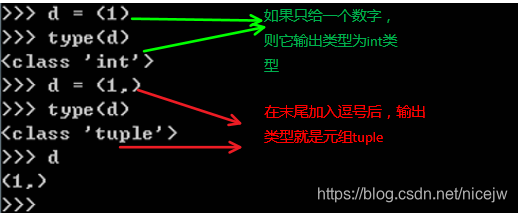 <3>、在Python中,如果只有一个元素,并且该元素是一个数字,则需要在末尾加上一个逗号来表示该变量是元组,而不是int类型的数字。