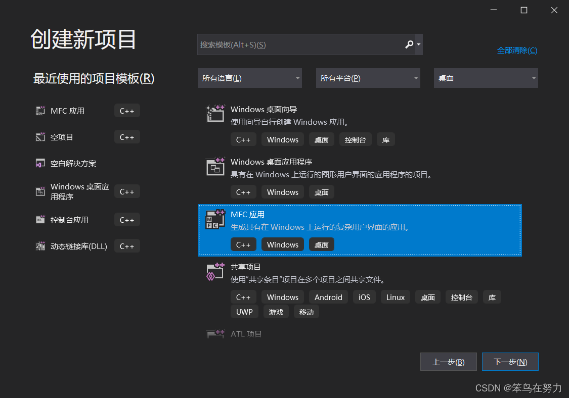 接下来创建一个MFC项目。注:本人使用的是Visual Studio 2019。