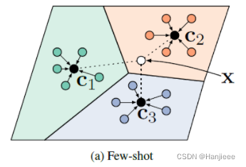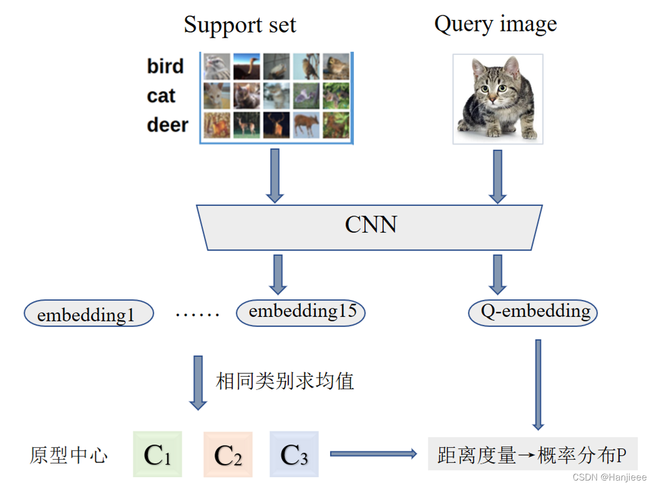 预测query image:将query set中的每个样本query image x 输入编码器,每个x对应得到一个embedding向量,该向量离哪个原型中心c 最近,就预测x 应为哪一类。