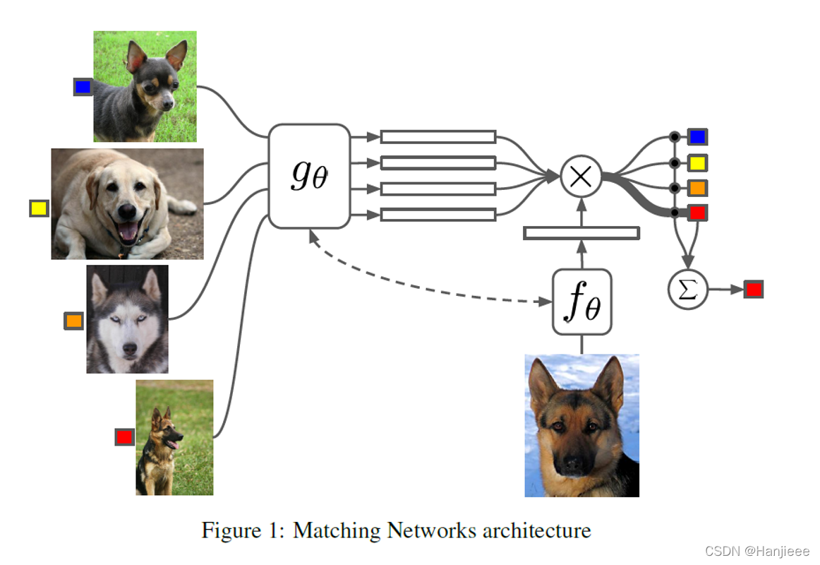 首先对support set和query set进行embedding,然后用query image对support set中的每个样本计算注意力: