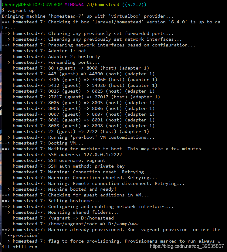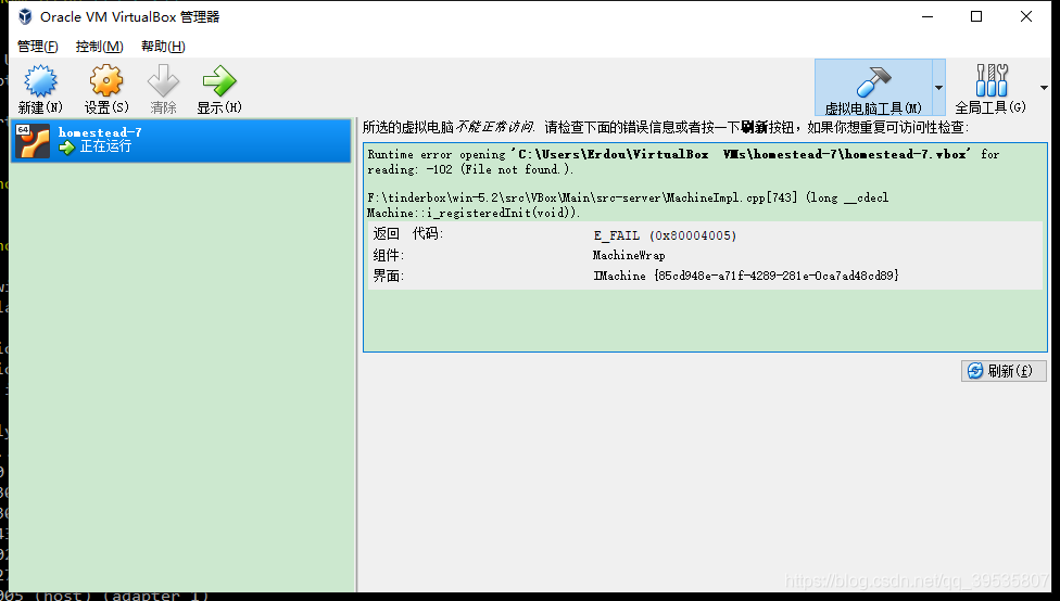 主要看:Runtime error opening ‘C:\Users\Erdou\VirtualBox VMs\homestead-7\homestead-7.vbox’ for reading: -102 (File not found.).