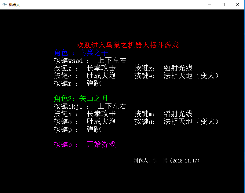 当前ai大火,机器人也是日常生活中的一个热点,自己在小学乃至高中也经常玩格斗游戏。曾经也想过格斗游戏是怎么做的,可是那时候条件有限,而且也没有编程基础。这个想法就一直留到了大学。到大三学习计算机图形学,也有了一定的编程基础,认为这个格斗游戏可以自己完成了。便开始动手,经过几天的努力,终于把这个游戏实现了。