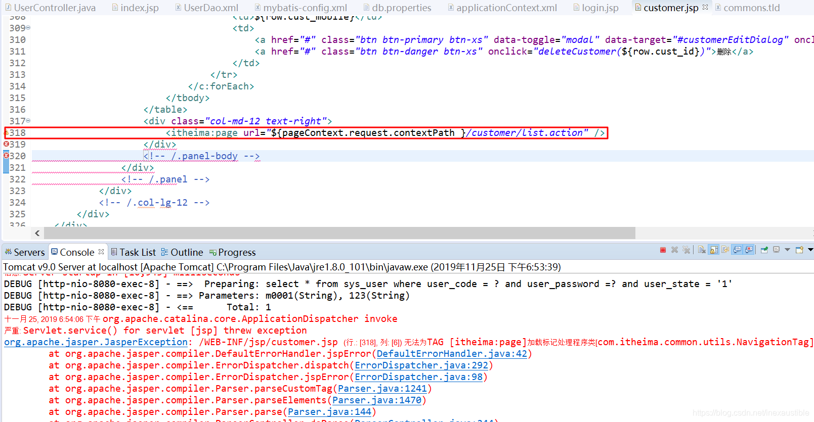 org.apache.jasper.JasperException: /WEB-INF/jsp/customer.jsp (行.: [318], 列: [6]) 无法为TAG [itheima:page]加载标记处理程序类[com.itheima.common.utils.NavigationTag]