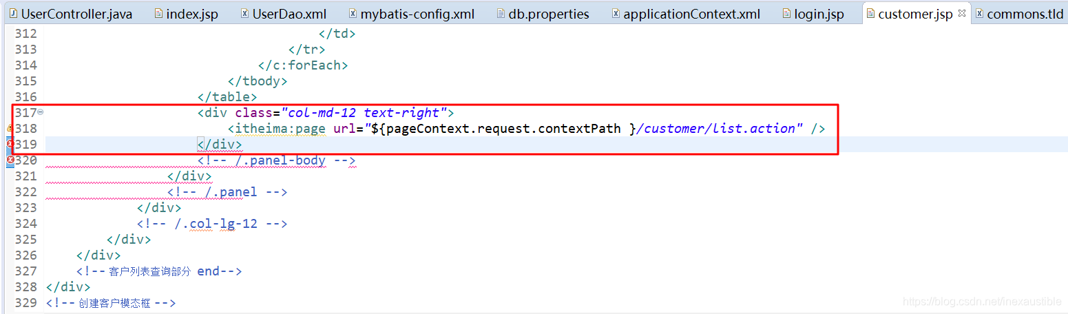 /WEB-INF/jsp/customer.jsp (行.: [318], 列: [6]) 无法为TAG [itheima:page]加载标记处理程序类[com.itheima.common.utils.NavigationTag]