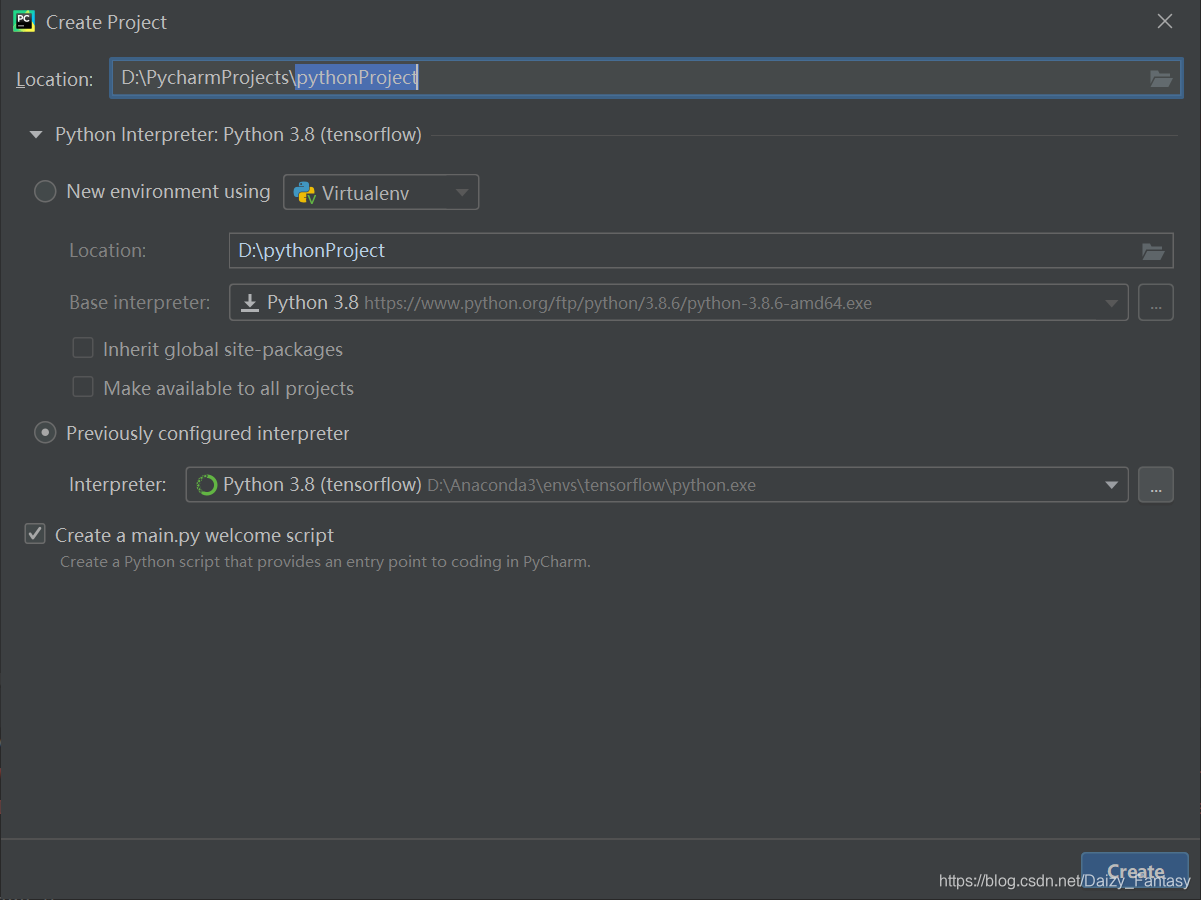 3. 安装完成后,打开PyCharm新建项目,选择Previously configured interpreter来使用我们在Anaconda里创建的conda环境